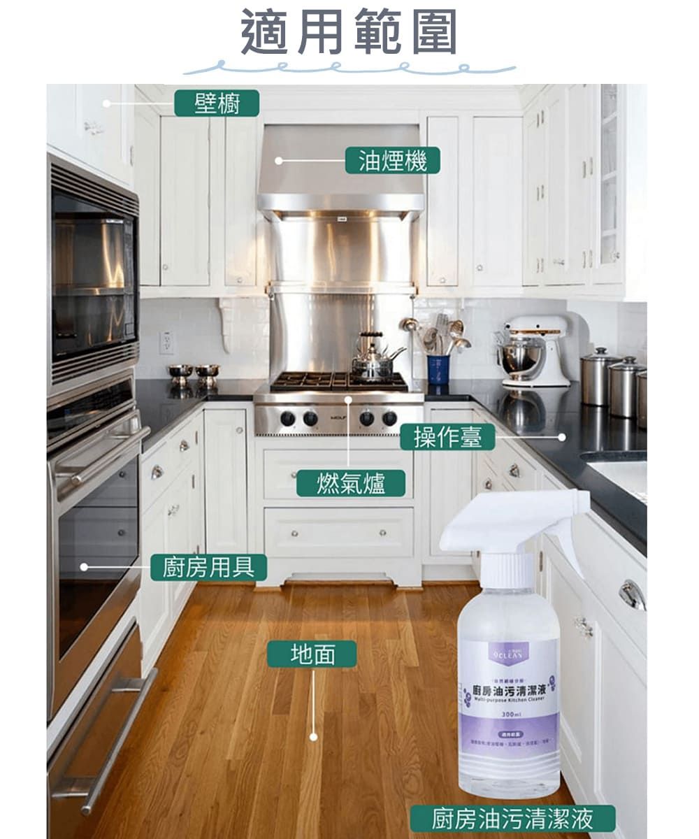 適用範圍:廚房設備(抽油煙機、流理臺、油殼)、桌面、地板、碗盤餐具、衣物污漬、機油、沙發、陽台...等