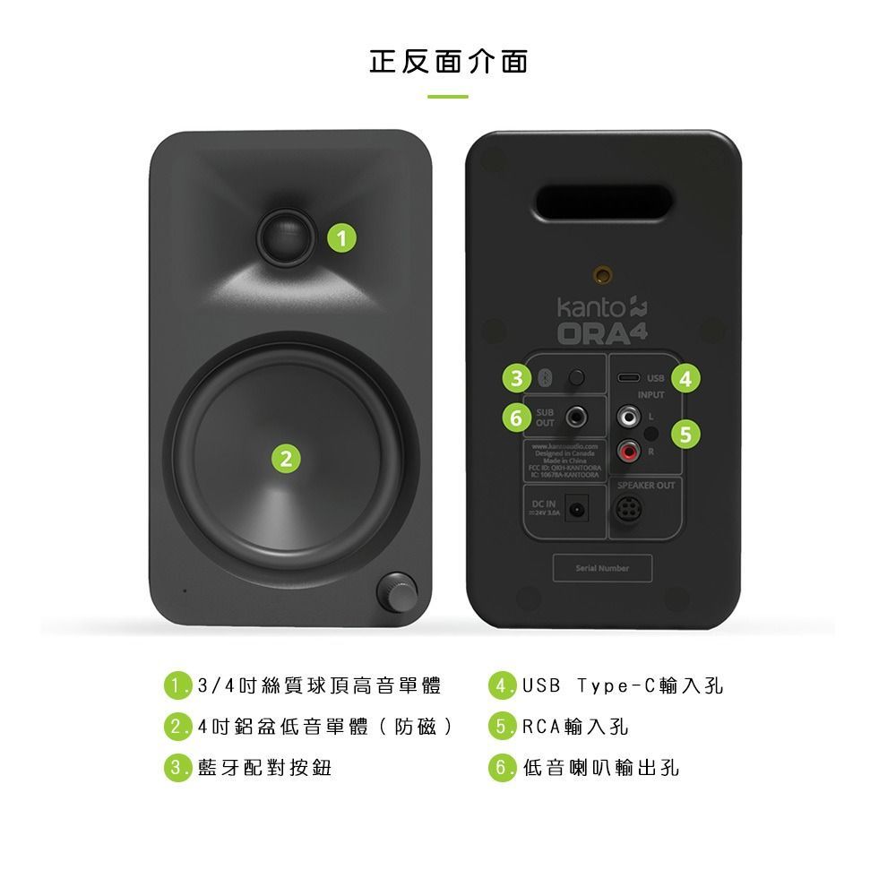 Kanto ORA4具有USB有線連接、無線藍牙連接、RCA有線連接,共三種音源輸入方式,可滿足大部分使用需求。