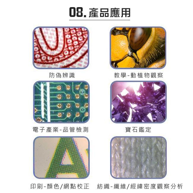 適用教學動植物觀察、品管檢測、驗鈔、物品鑑定等各方面應用。