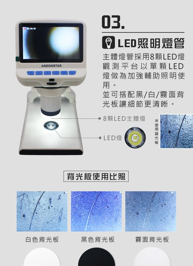 焦距筒主體燈光內置8顆LED燈搭配載物臺的燈輔助照明,亮度更充足使檢測、觀察更清楚,