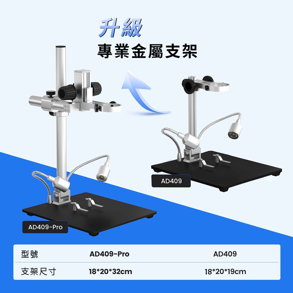 內容物:AD409 Pro顯微鏡主機x1/金屬支架x1/底板x1(含2個蛇管燈)/USB傳輸線(接電腦)x1/電源線x1/HDMI線x1/紅外線遙控器x1/電源適配器x1/扳手x1/金屬夾x1