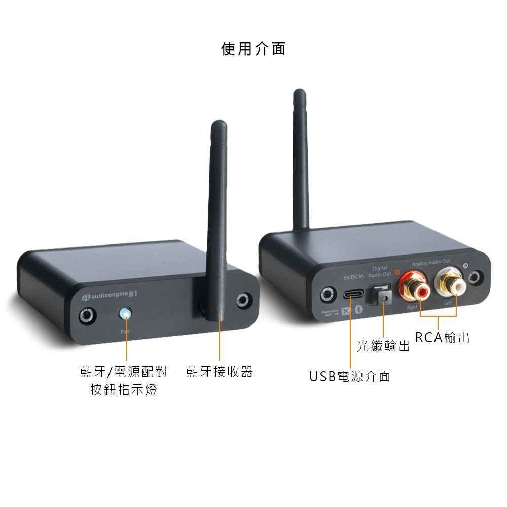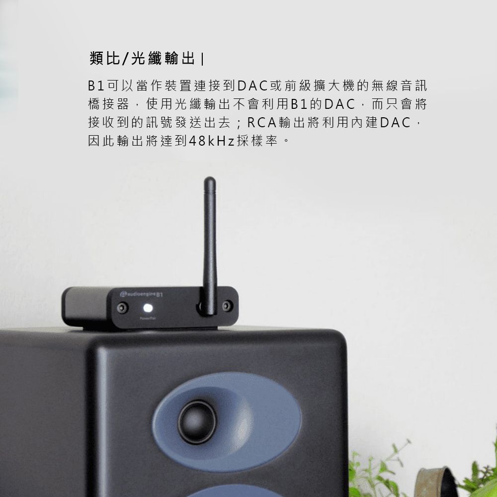 B1可以當作裝置連接到DAC或前級擴大機的無線音訊橋接器,使用光纖輸出不會利用B1的DAC,而只會將接收到的訊號發送出去;RCA輸出將利用內建DAC,因此輸出將達到48kHz採樣率。