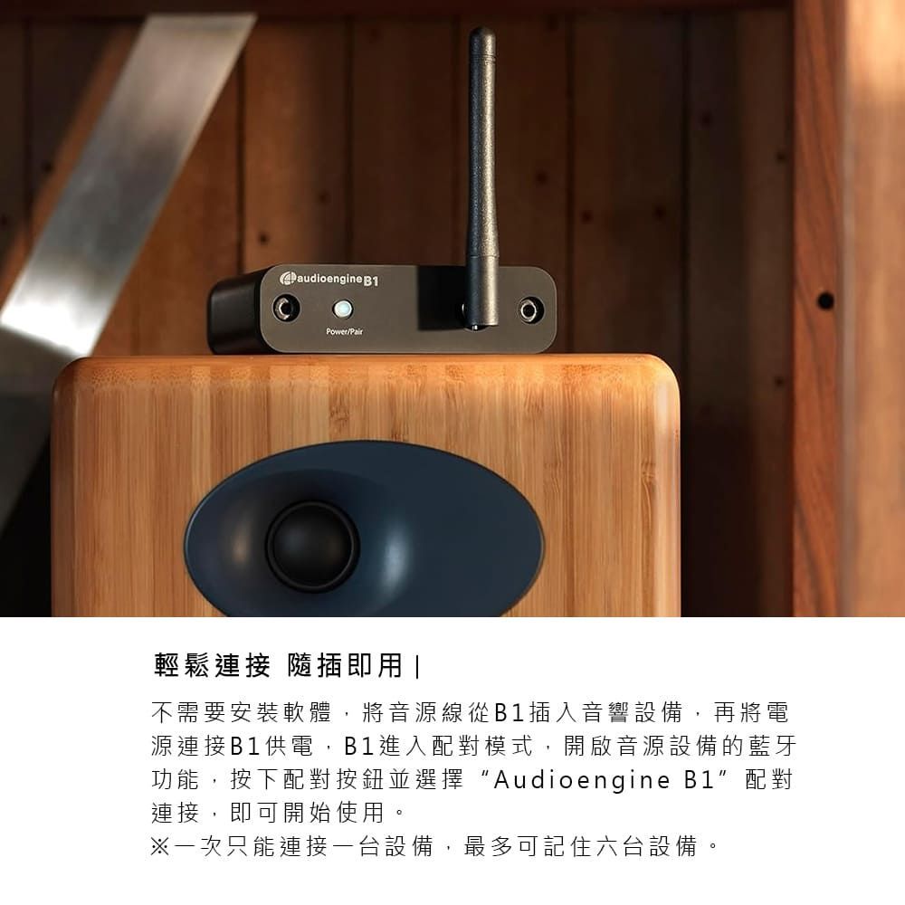 不需要安裝軟體,將音源線從B1插入音響設備,再將電源連接B1供電,B1進入配對模式,開啟音源設備的藍牙功能,按下配對按鈕並選擇“Audioengine B1”配對連接,即可開始使用。