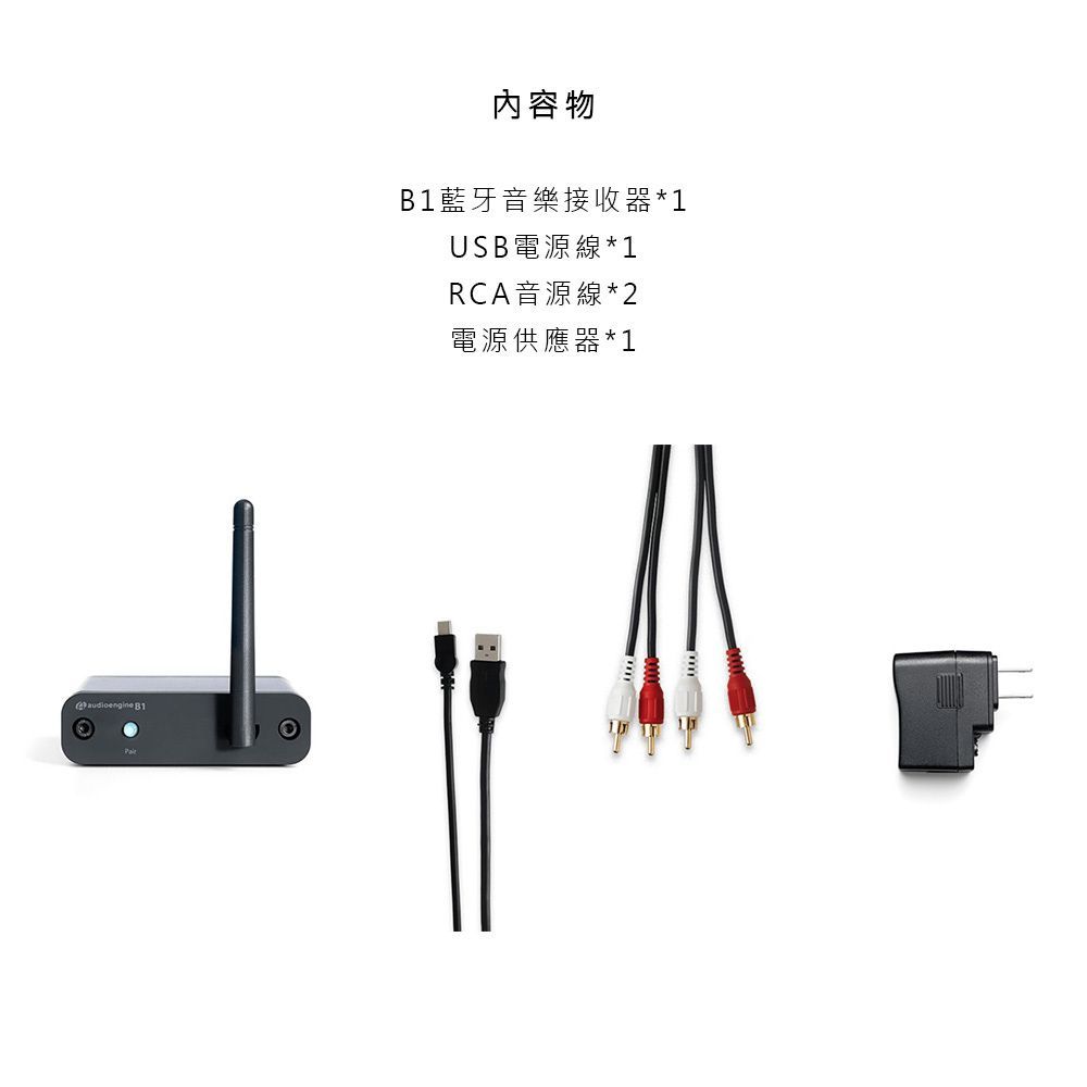 本產品內容物包含:B1*1、USB電源線*1、RCA音源線*2、電源供應器*1,照片中手機、音響等僅為示意使用,無包含於本產品內。