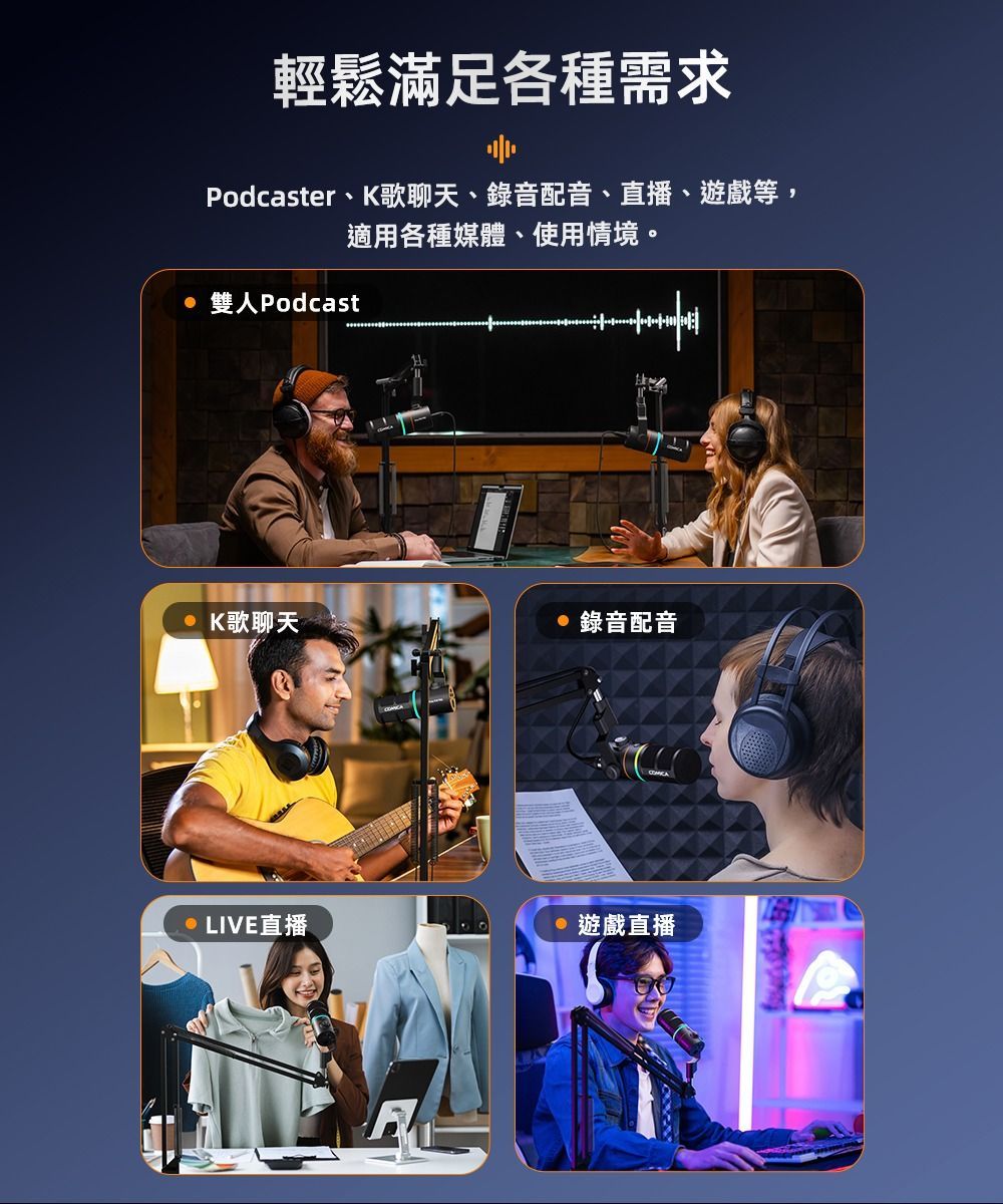 麥克風支援 USB-C 數位輸出與 XLR 類比輸出,兼容手機、電腦、音頻介面等多種設備。適用於Podcaster、遊戲、直播、錄音等多種場景需求。