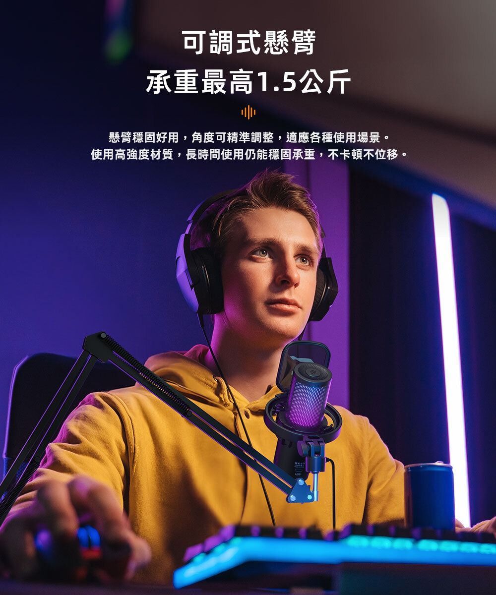 注意事項:懸臂型產品僅包含: 麥克風*1、接收器*1、防噴罩*1、USB-C充電傳輸線*1、USB-C轉USB-A轉接頭*1、懸臂支架*1、魔術貼*5、使用說明書*1。