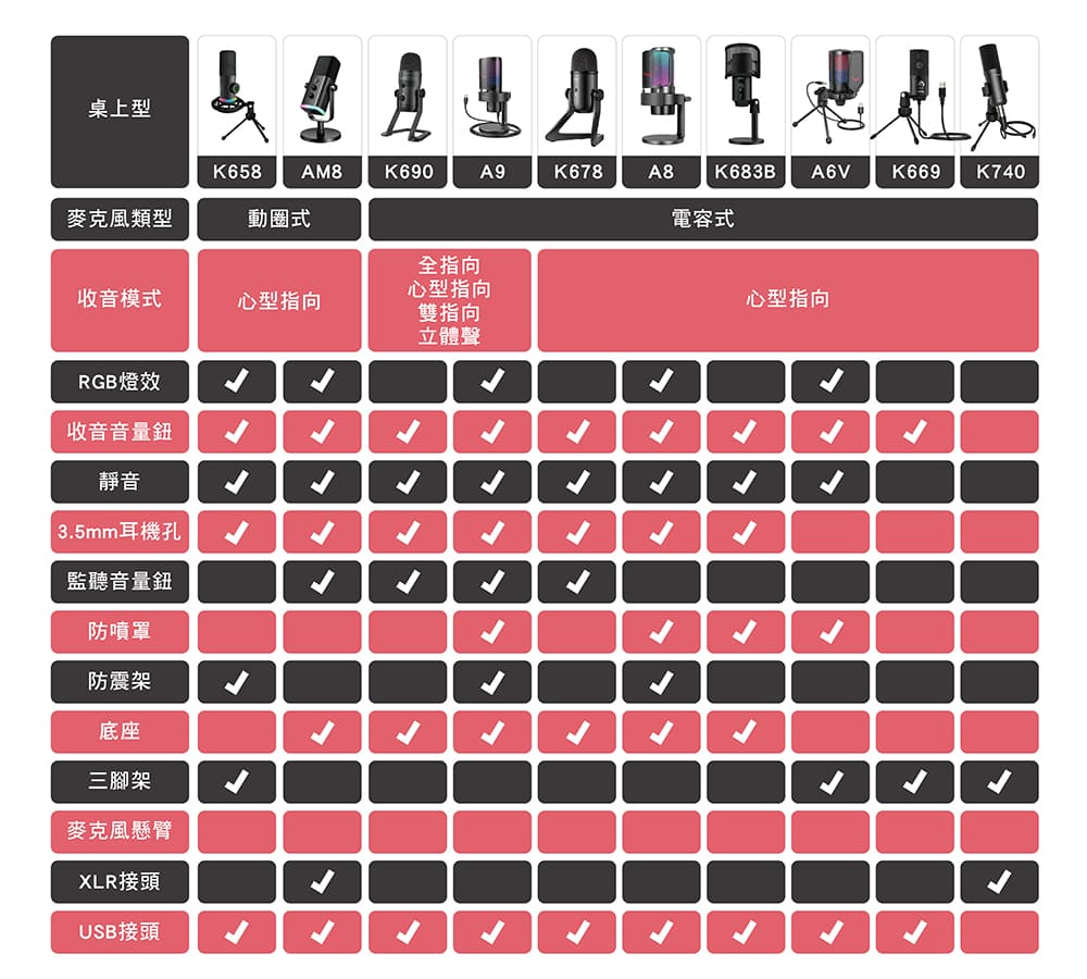 1. 產品內含A6V麥克風*1、防震架*1、防噴罩*1、三腳架*1、傳輸線*1、說明書*1。