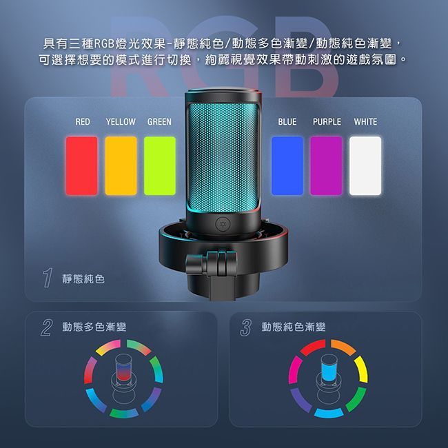 具有三種RGB燈光效果-靜態純色/動態多色漸變/動態純色漸變,