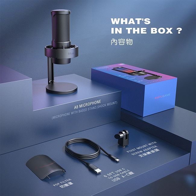 1. 產品內含A8麥克風*1、防噴罩*1、支架轉接頭*1、傳輸線*1、說明書*1。