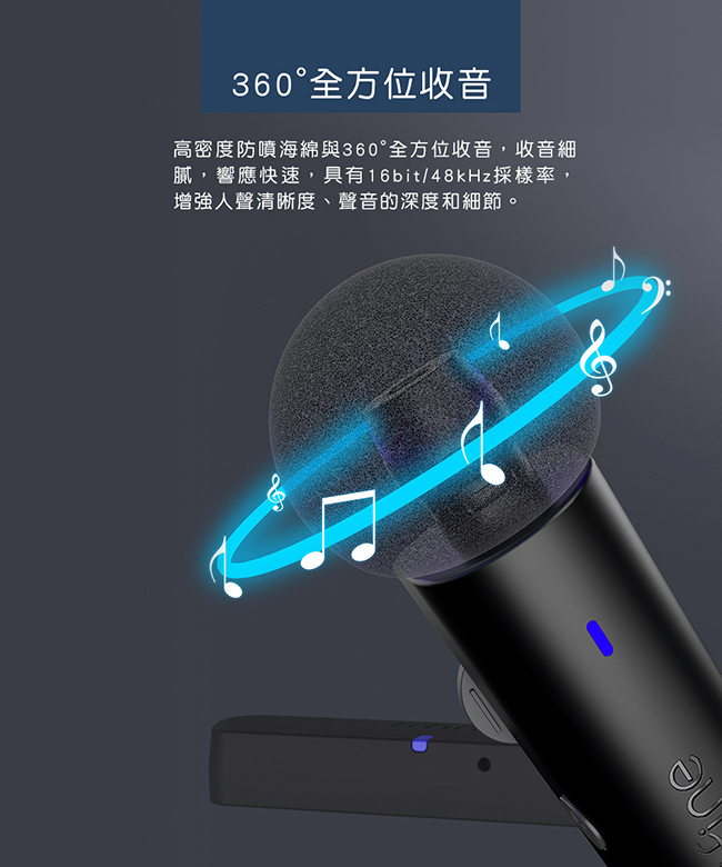 高密度防噴海綿與360°全方位收音,收音細膩,響應快速,