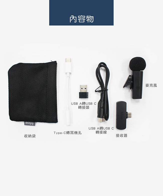 1. 產品內含M6麥克風*1、接收器*1、USB A轉USB C轉接線*1、USB A轉USB C轉接頭*1、Type-C轉耳機孔*1、說明書*1。