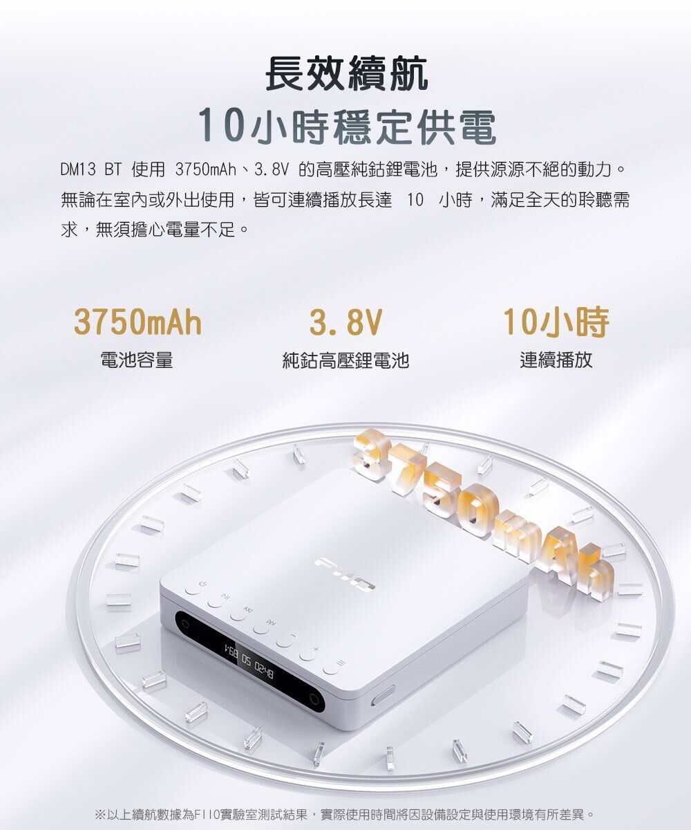 ※以上續航數據為FIIO實驗室測試結果,實際使用時間將因設備設定與使用環境有所差異。