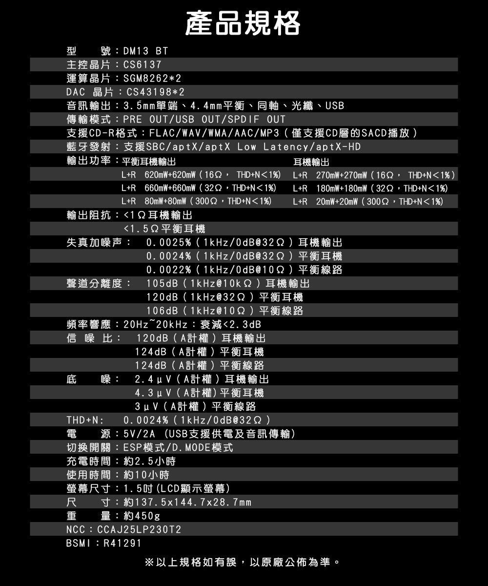音訊輸出:3.5mm單端、4.4mm平衡、同軸、光纖、USB