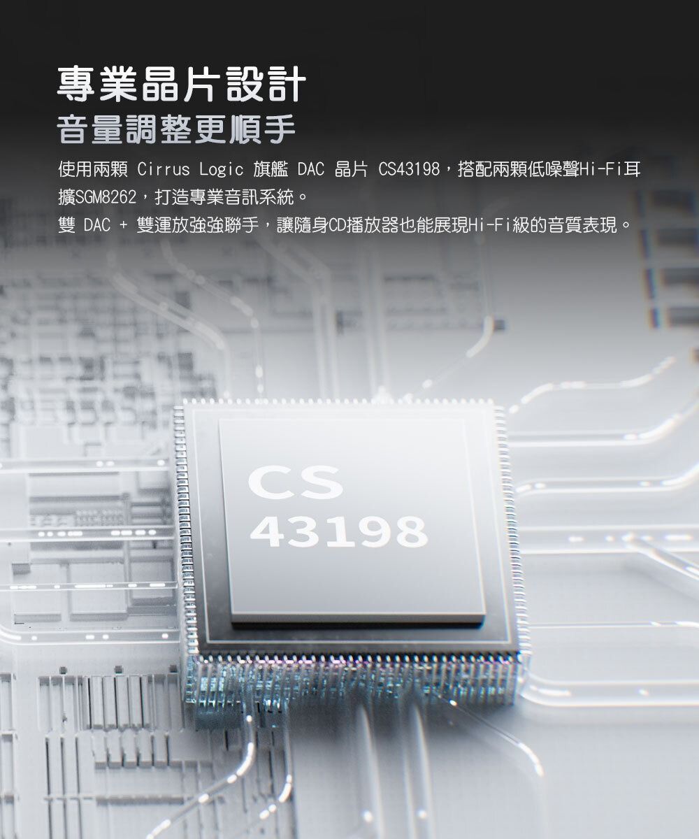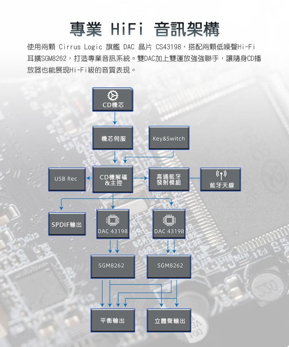 與市面上多數隨身CD播放器不同,DM13 BT使用兩顆獨立 Cirrus Logic 旗艦 DAC 晶片 CS43198,具備高效能與低功耗特性,音質表現卓越。