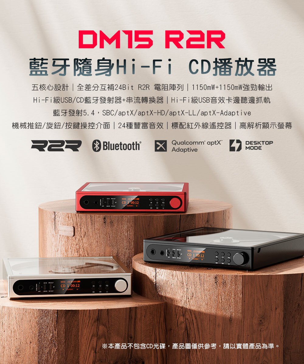 注意事項:1.本產品僅包含:DM15 R2R*1、遙控器*1、USB-A轉Type-C充電傳輸線*1、說明書*1、3.5mm同軸轉接線*1,其他CD、耳機、電腦...等僅為示意圖,不包含在本產品包裝內。