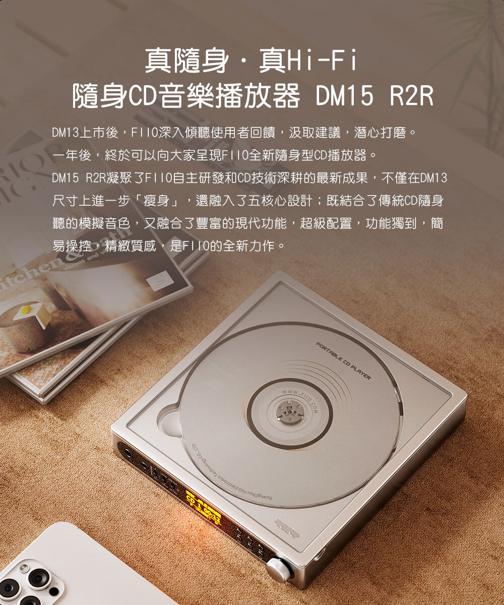 DM15 R2R凝聚了FIIO自主研發和CD技術深耕的最新成果,不僅在DM13體積上進一步縮減尺寸,還融入了五核心設計;既結合了傳統CD隨身聽的模擬音色,又融合了豐富的現代功能,超級配置,功能獨到,簡易操控,精緻質感,是FIIO的全新力作。
