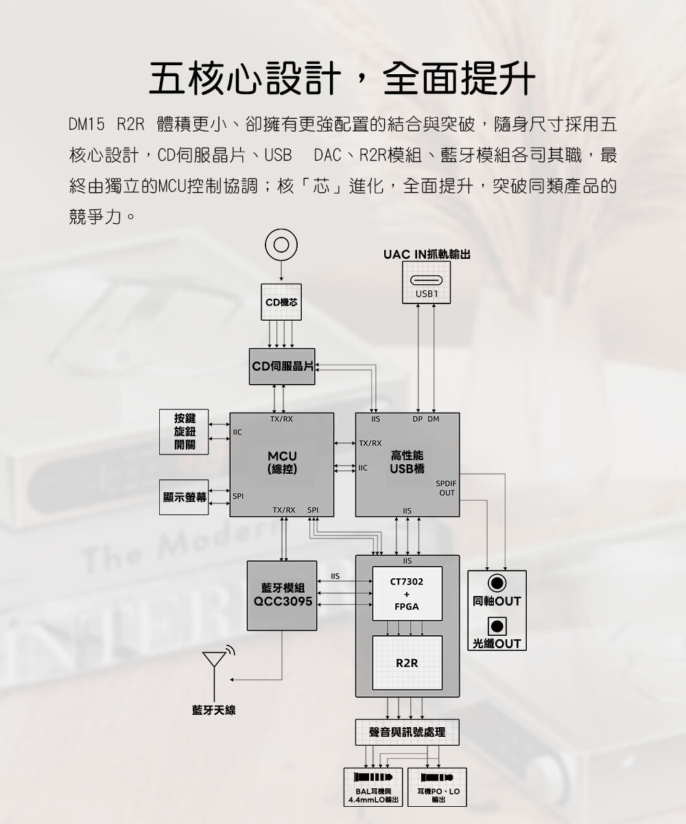 DM15 R2R 體積更小、卻擁有更強配置的結合與突破,隨身尺寸採用五核心設計,CD伺服晶片、USB DAC、R2R模組、藍牙模組各司其職,最終由獨立的MCU控制協調。