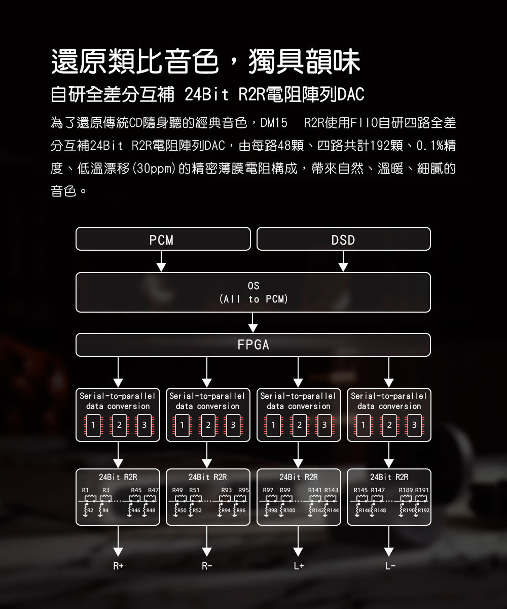 為了還原傳統CD隨身聽的經典音色,DM15 R2R使用FIIO自研四路全差分互補24Bit R2R電阻陣列DAC,由每路48顆、四路共計192顆、0.1%精度、低溫漂移(30ppm)的精密薄膜電阻構成,帶來自然、溫暖、細膩的音色。