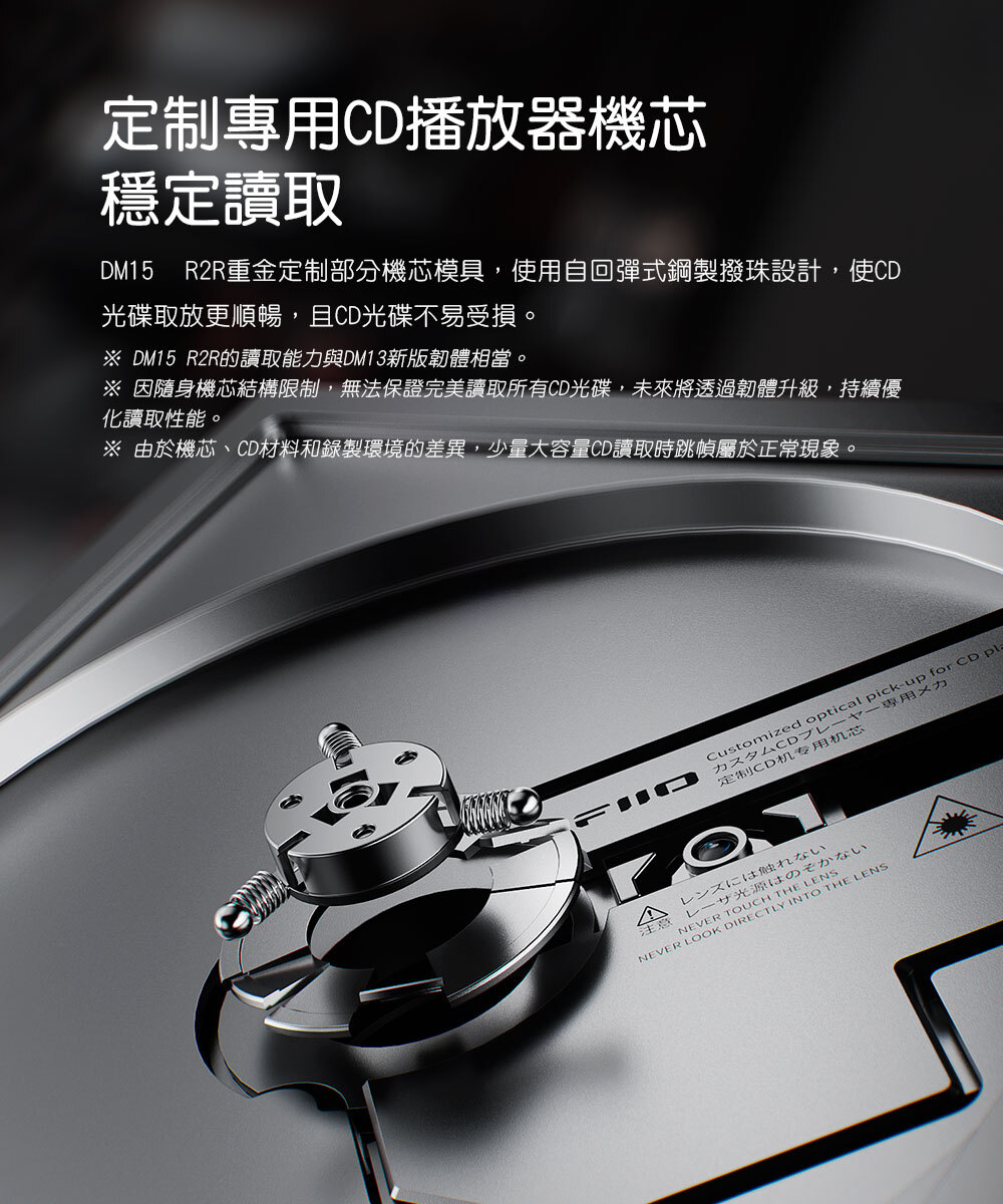 DM15 R2R重金定制部分機芯模具,使用自回彈式鋼製撥珠設計,使CD光碟取放更順暢,且CD光碟不易受損。