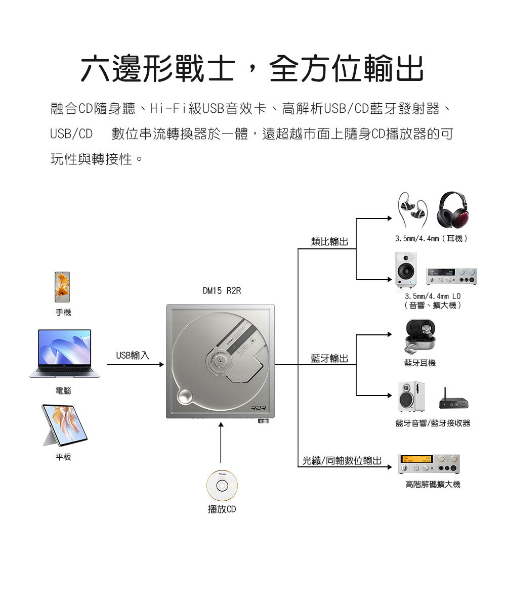 融合CD隨身聽、Hi-Fi級USB音效卡、高解析USB/CD藍牙發射器、USB/CD 數位串流轉換器於一體,遠超越市面上隨身CD播放器的可玩性與轉接性。