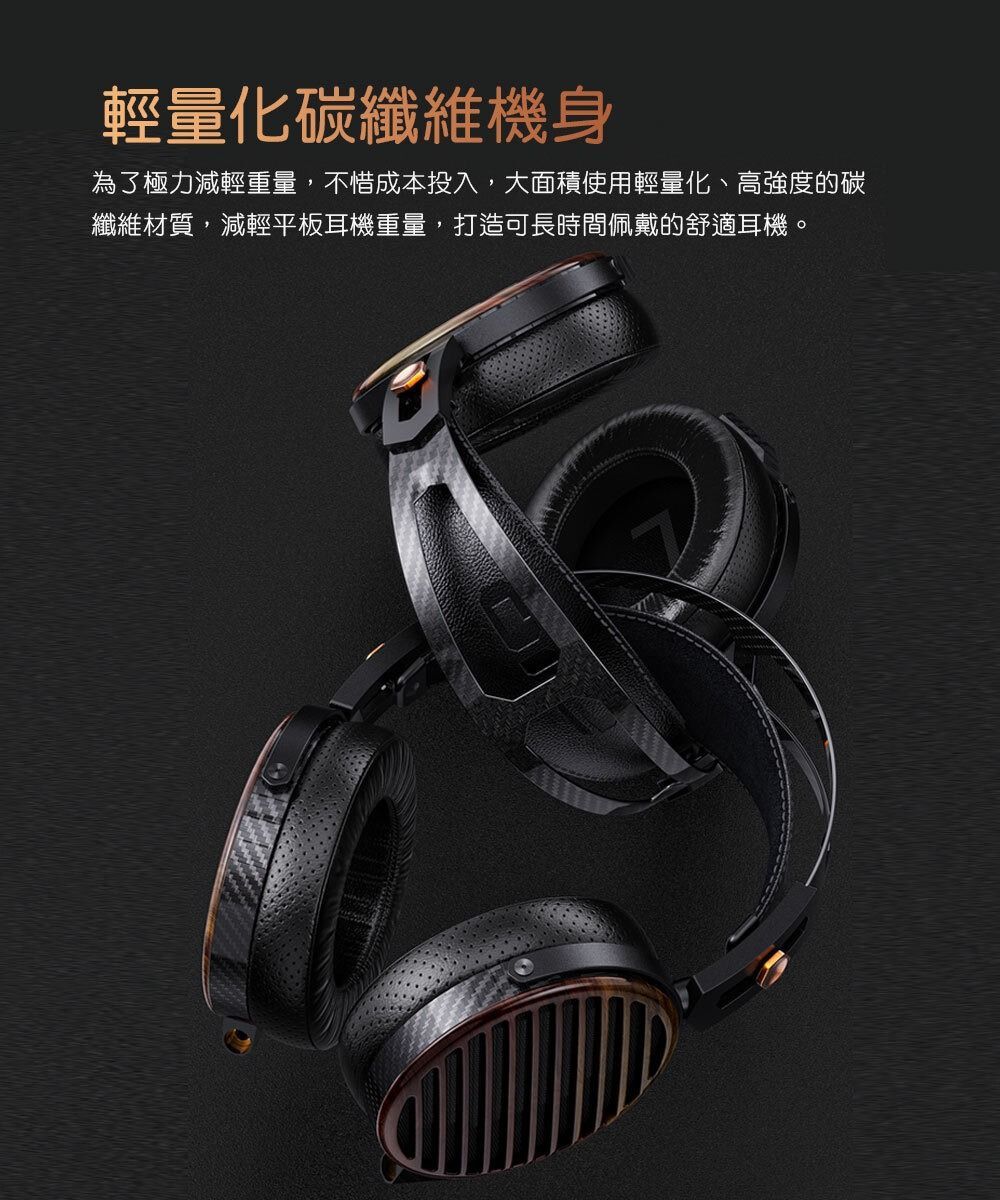 為了極力減輕重量,不惜成本投入,大面積使用輕量化,高強度的碳纖維材質,減輕平板耳機重量,打造可長時間佩戴的舒適耳機。