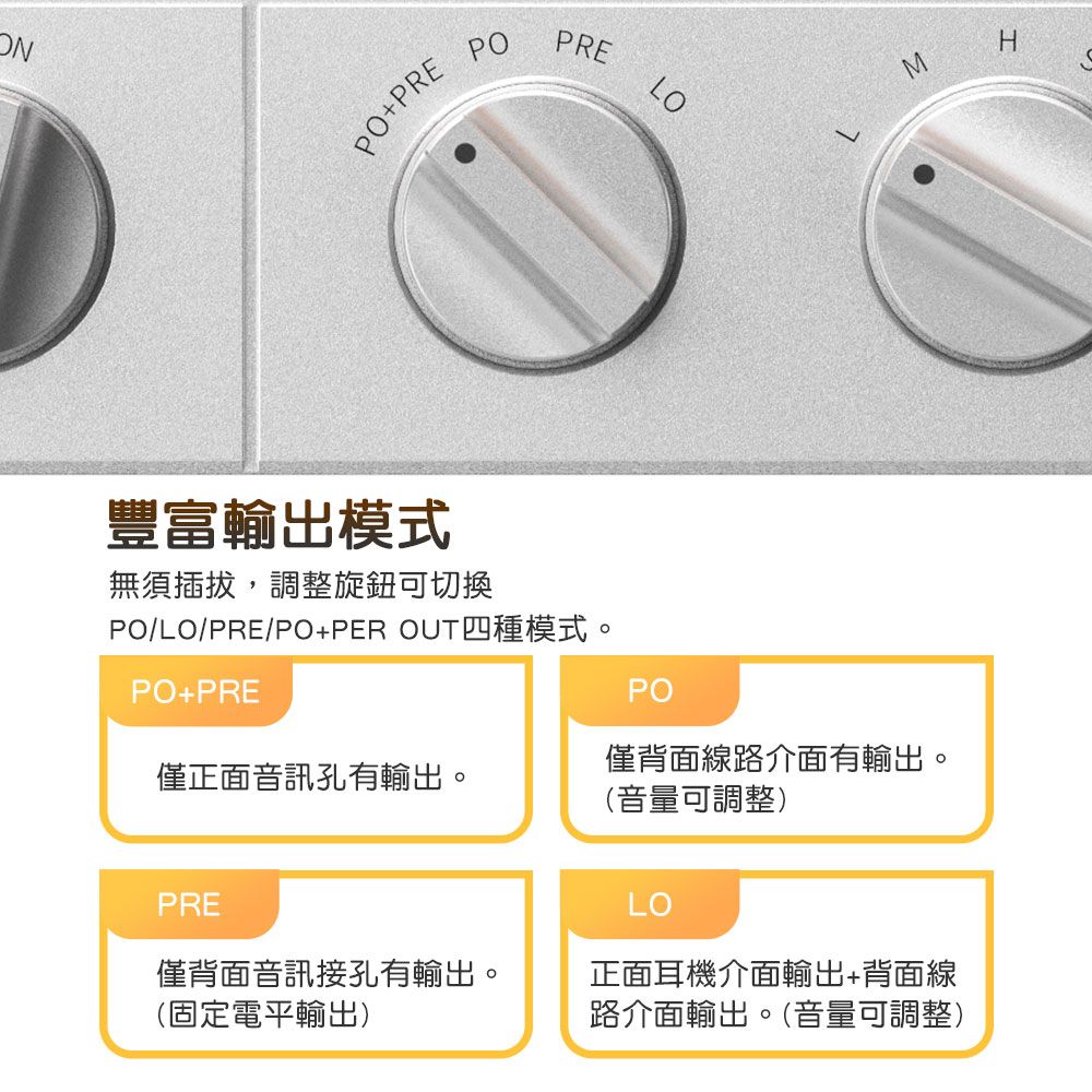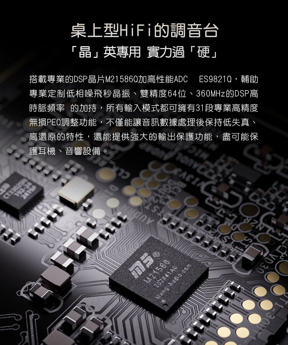 桌上型HiFi的調音台 無損調音,輕鬆上手|搭載專業的DSP晶片M21586Q加高性能ADCES9821Q,輔助專業定制低相噪飛秒晶振、雙精度64位、360MHz的DSP高時脈頻率的加持,所有輸入模式都可擁有31段專業高精度無損PEQ調整功能,不僅能讓音訊數據處理後保持低失真、高還原的特性,還能提供強大的輸出保護功能,盡可能保護耳機、音響設備。