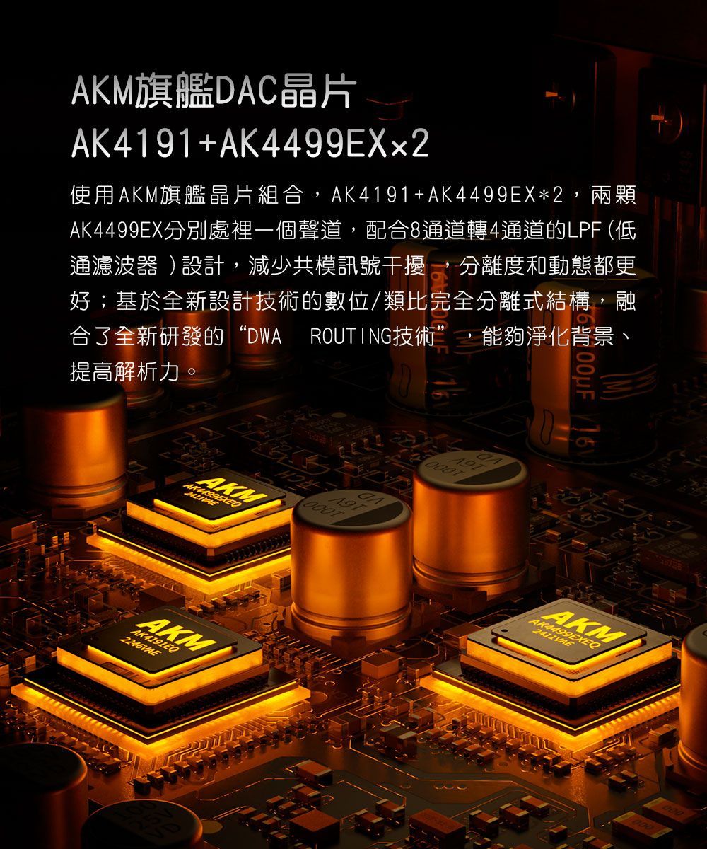 AKM旗艦DAC晶片AK4191+AK4499EX*2|使用AKM旗艦晶片組合,AK4191+AK4499EX*2,兩顆AK4499EX分別處裡一個聲道,配合8通道轉4通道的LPF(低通濾波器)設計,減少共模訊號干擾,分離度和動態都更好;基於全新設計技術的數位/類比完全分離式結構,融合了全新研發的“DWA ROUTING技術”,能夠淨化背景、提高解析力。