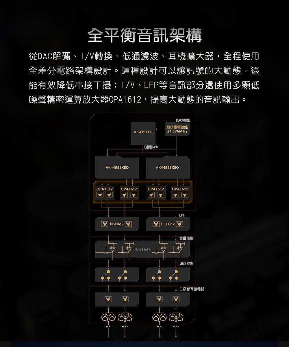 全平衡音訊架構|從DAC解碼、I/V轉換、低通濾波、耳機擴大器,全程使用全差分電路架構設計。這種設計可以讓訊號的大動態,還能有效降低串接干擾;I/V、LFP等音訊部分還使用多顆低噪聲精密運算放大器OPA1612,提高大動態的音訊輸出。
