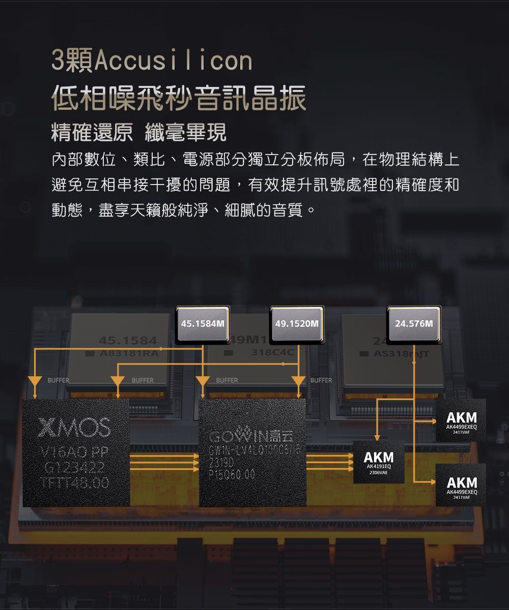 3顆Accusilicon低相噪飛秒音訊晶振|內部數位、類比、電源部分獨立分板佈局,在物理結構上避免互相串接干擾的問題,有效提升訊號處裡的精確度和動態,盡享天籟般純淨、細膩的音質。