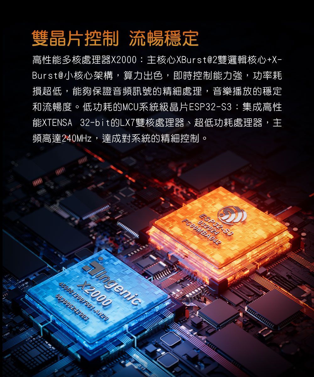 雙晶片控制 流暢穩定|高性能多核處理器X2000:主核心XBurst@2雙邏輯核心+XBurst@小核心架構,算力出色,即時控制能力強,功率耗損超低,能夠保證音頻訊號的精細處理,音樂播放的穩定和流暢度。低功耗的MCU系統級晶片ESP32-S3:集成高性能Xtensa32 bit的LX7雙核處理器、超低功耗處理器,主頻高達240MHz,達成對系統的精細控制。