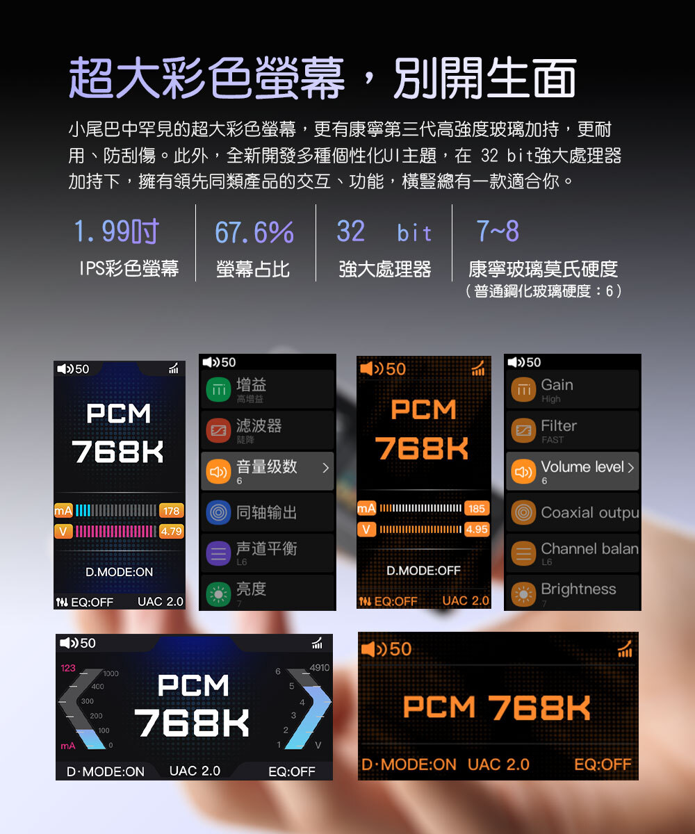 超大彩色螢幕|小尾巴中罕見的超大彩色螢幕,更有康寧第三代高強度玻璃加持,更耐用、防刮傷。此外,全新開發多種個性化UI主題,在32bit強大處理器加持下,擁有領先同類產品的交互、功能,橫豎總有一款適合你。