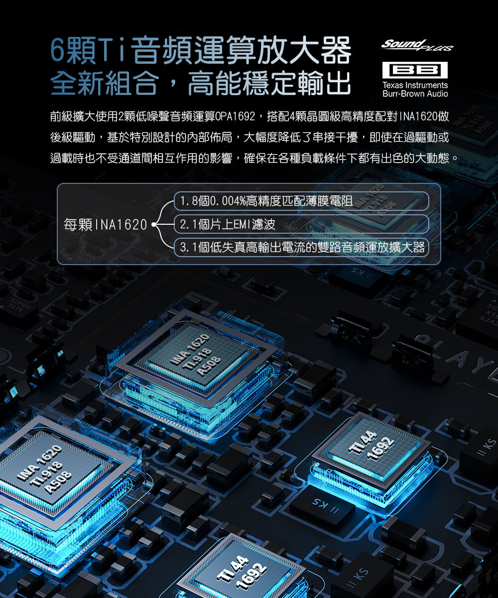 6顆Ti音頻運算放大器|前級擴大使用2顆低噪聲音頻運算OPA1692,搭配4顆晶圓級高精度配對INA1620做後級驅動,基於特別設計的內部佈局,大幅度降低了串接干擾,即使在過驅動或過載時也不受通道間相互作用的影響,確保在各種負載條件下都有出色的大動態。