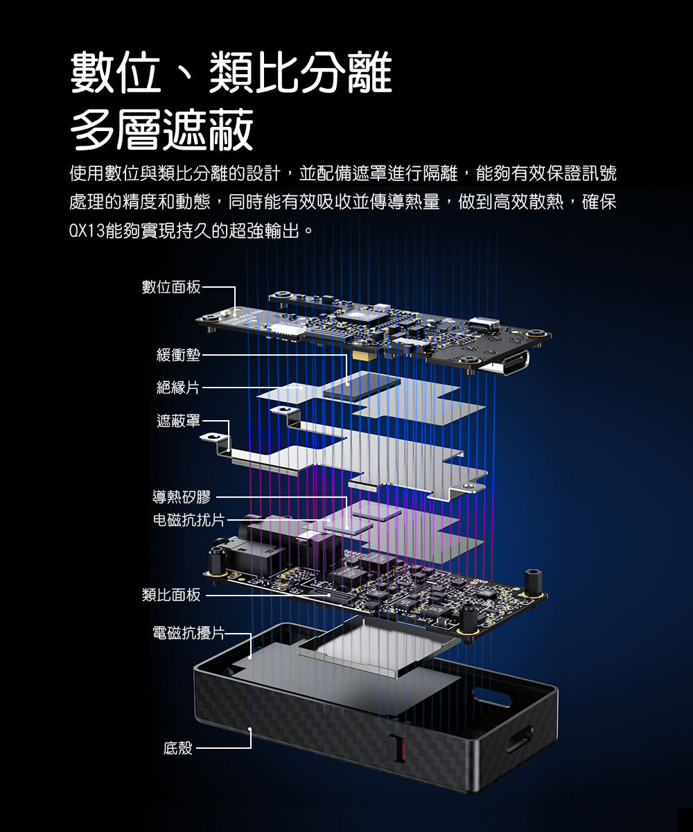 數位、類比分離,多層遮蔽|使用數位與類比分離的設計,並配備遮罩進行隔離,能夠有效保證訊號處理的精度和動態,同時能有效吸收並傳導熱量,做到高效散熱,確保QX13能夠實現持久的超強輸出。