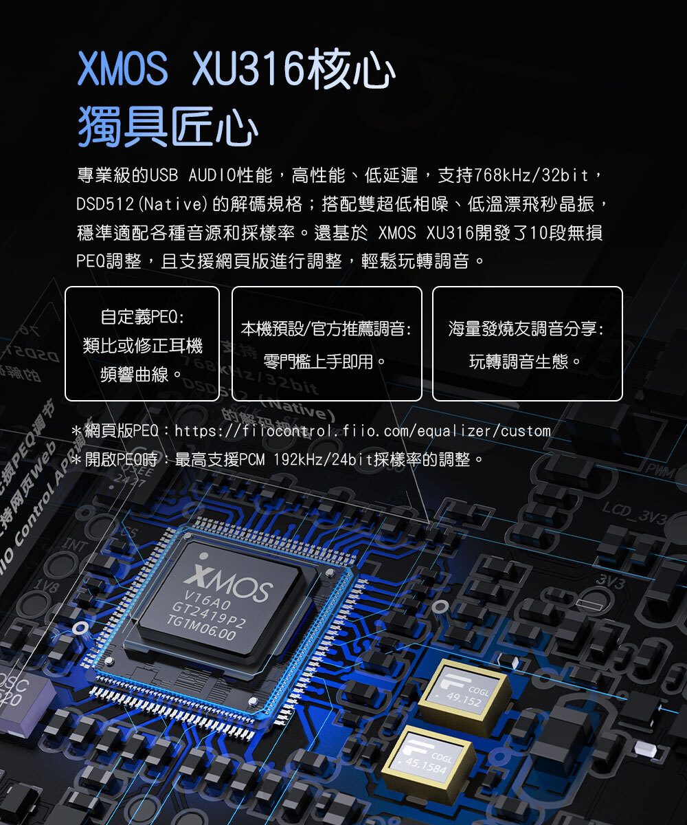 XMOS XU316核心|專業級的USB AUDIO性能,高性能、低延遲,支持768kHz/32bit,DSD512(Native)的解碼規格;搭配雙超低相噪、低溫漂飛秒晶振,穩準適配各種音源和採樣率。還基於XMOS XU316開發了10段無損PEQ調整,且支援網頁版進行調整,輕鬆玩轉調音。