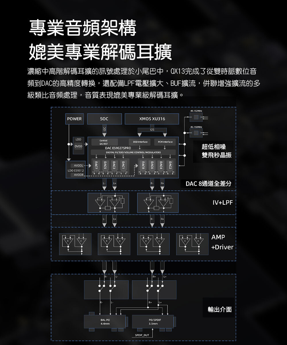 專業音頻架構|濃縮中高階解碼耳 擴的訊號處理於小尾巴中,QX13完成了從雙時脈數位音頻到DAC的高精度轉換,還配備LPF電壓擴大、BUF擴流,併聯增強擴流的多級類比音頻處理,音質表現媲美專業級解碼耳擴。