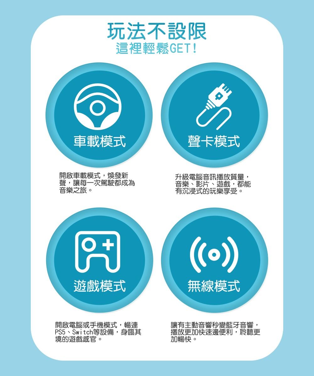 玩法不設限,這裡輕鬆GET! |車載模式、聲卡模式、遊戲模式、無線模式,多種情境應用模式可使用。