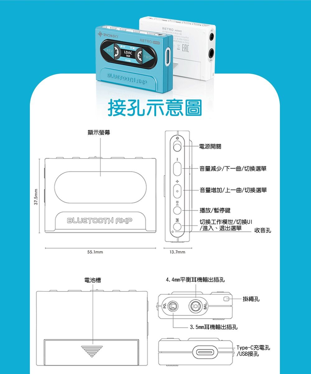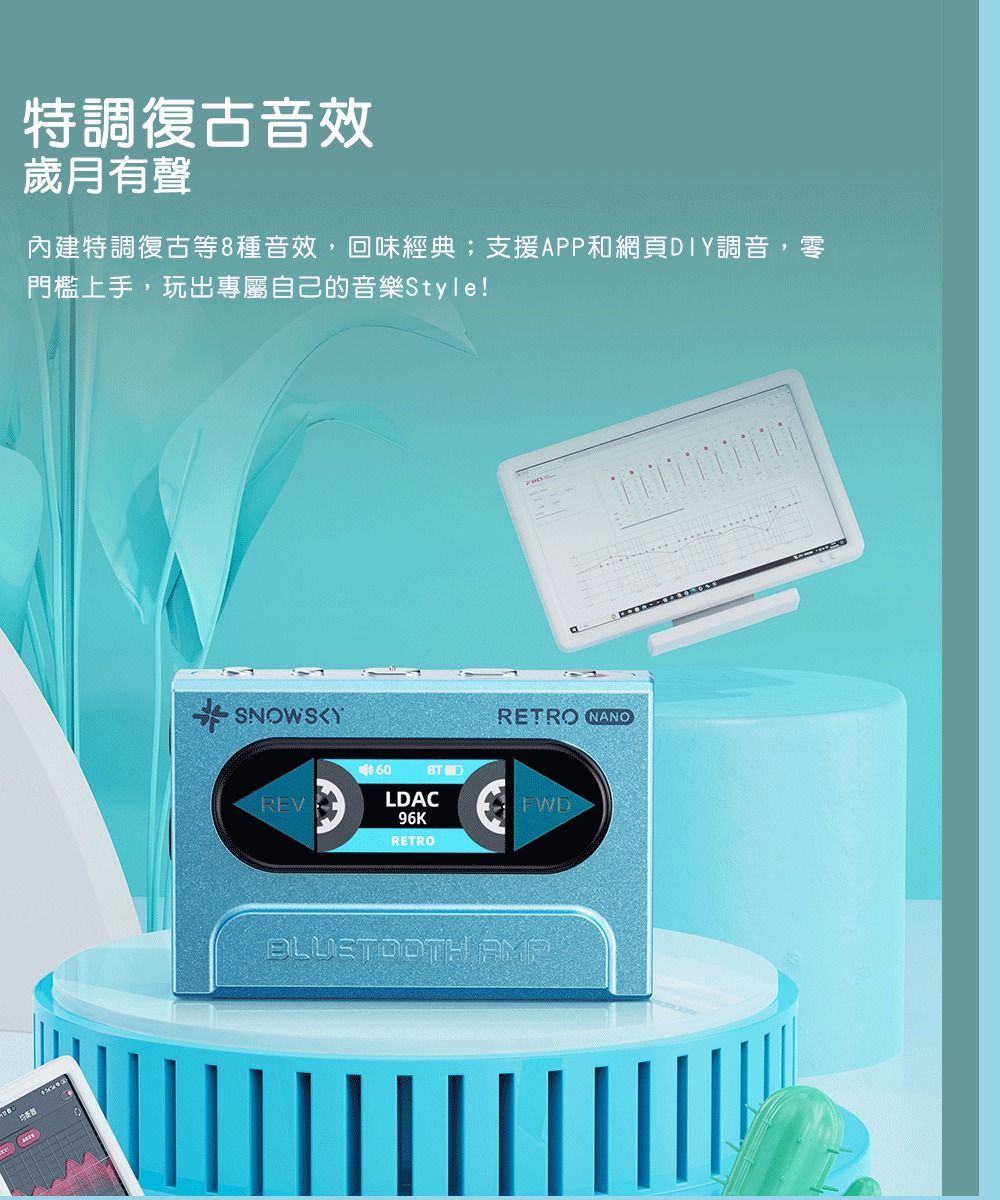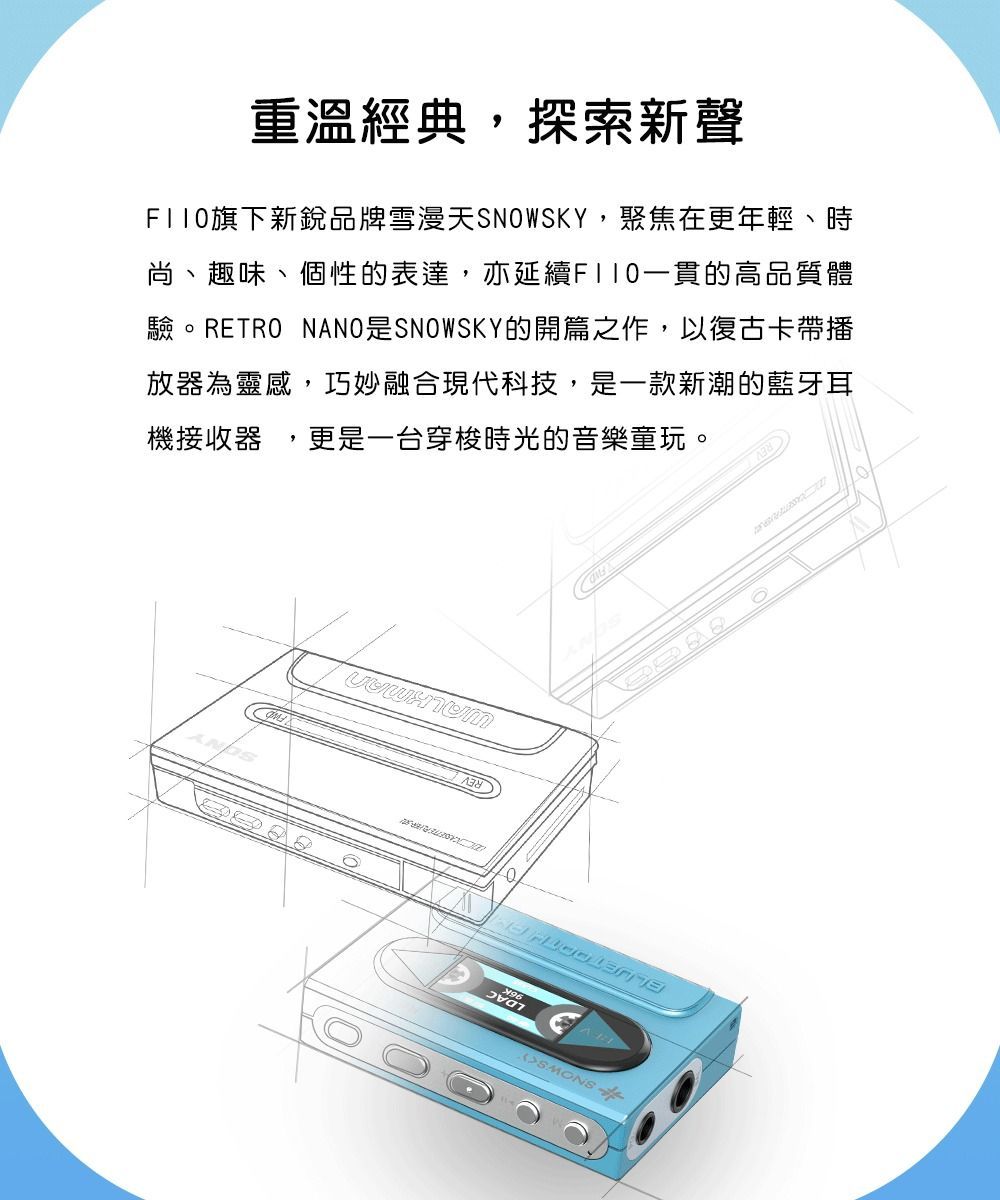 FIIO旗下新銳品牌雪漫天SNOWSKY,聚焦在更年輕、時尚、趣味、個性的表達,亦延續FIIO一貫的高品質體驗。RETRO NANO是SNOWSKY的開篇之作,以復古卡帶播放器為靈感,巧妙融合現代科技,是一款新潮的藍牙耳機接收器,更是一台穿梭時光的音樂童玩,帶您重溫經典,探索新聲。