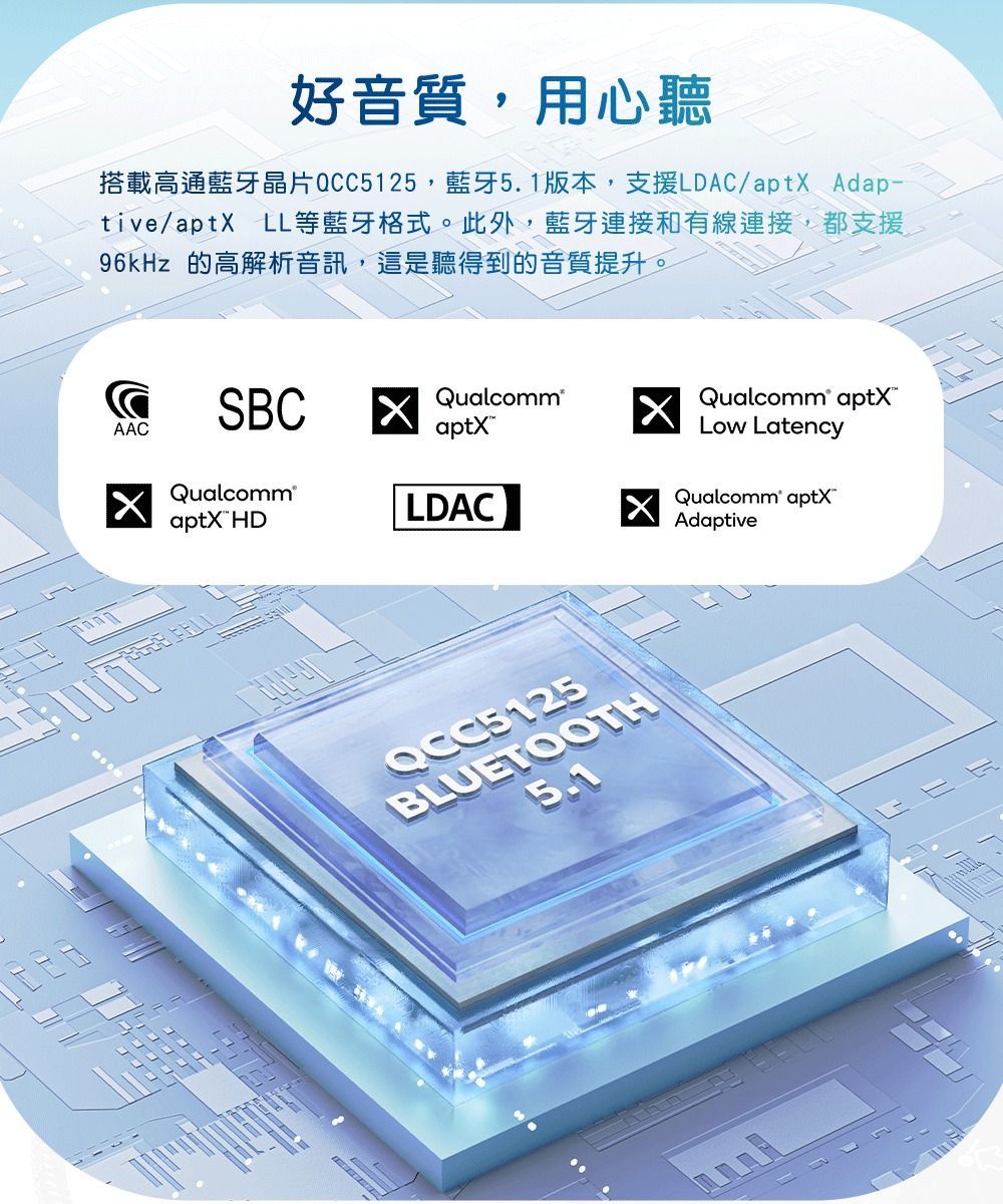 好音質,用心聽|搭載高通藍牙晶片QCC5125,藍牙5.1版本,支援LDAC/aptX Adaptive/aptX LL等藍牙格式。此外,藍牙連接和有線連接,都支援96kHz的高解析音訊。