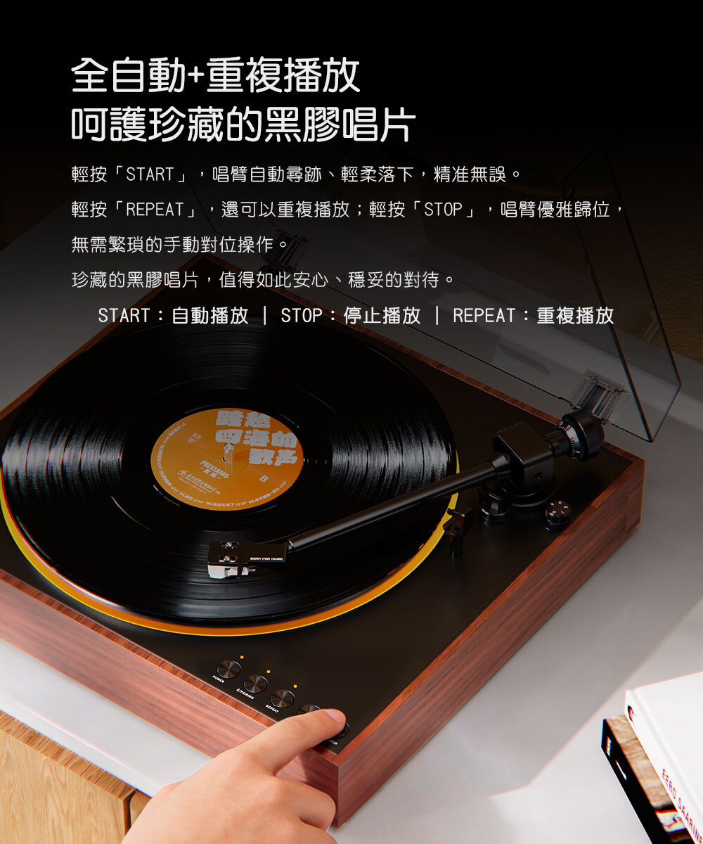 輕按「REPEAT」,還可以重複播放;輕按「STOP」,唱臂優雅歸位,無需繁瑣的手動對位操作。