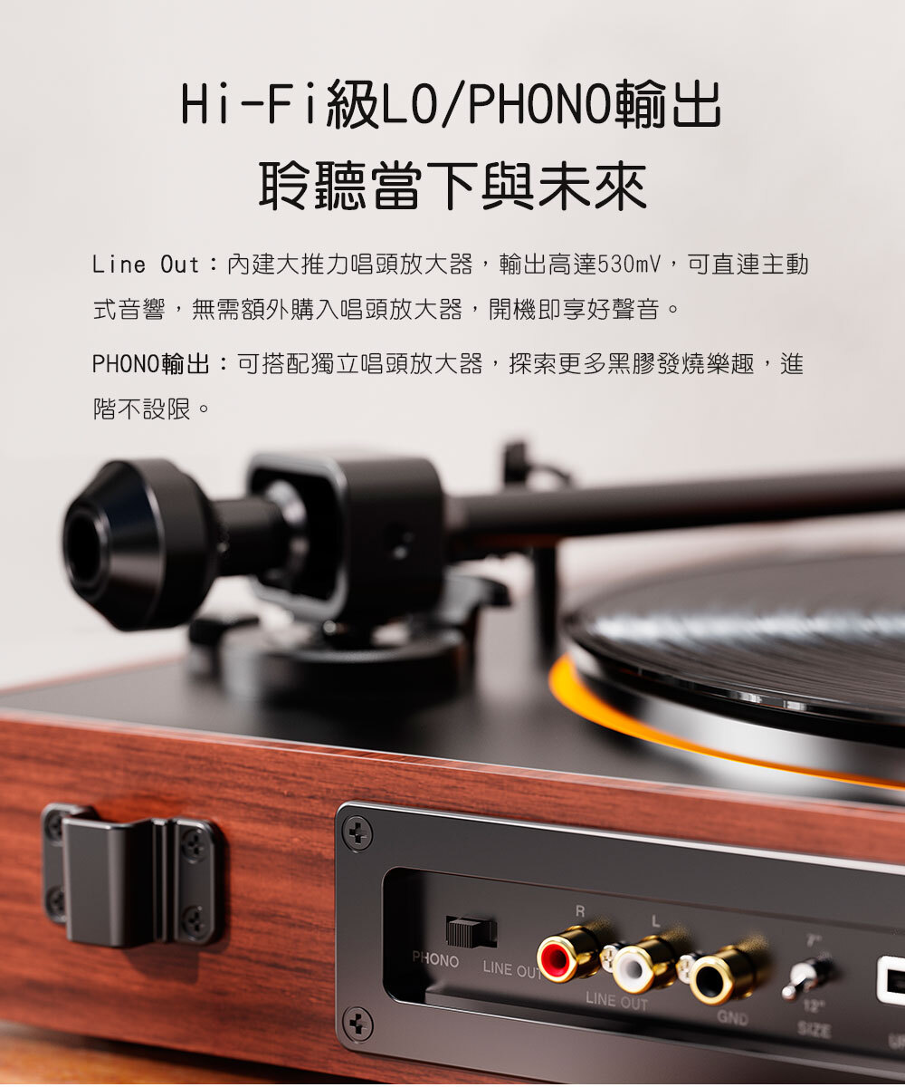 Line Out|內建大推力唱頭放大器,輸出高達530mV,可直連主動式音響,無需額外購入唱頭放大器,開機即享好聲音。