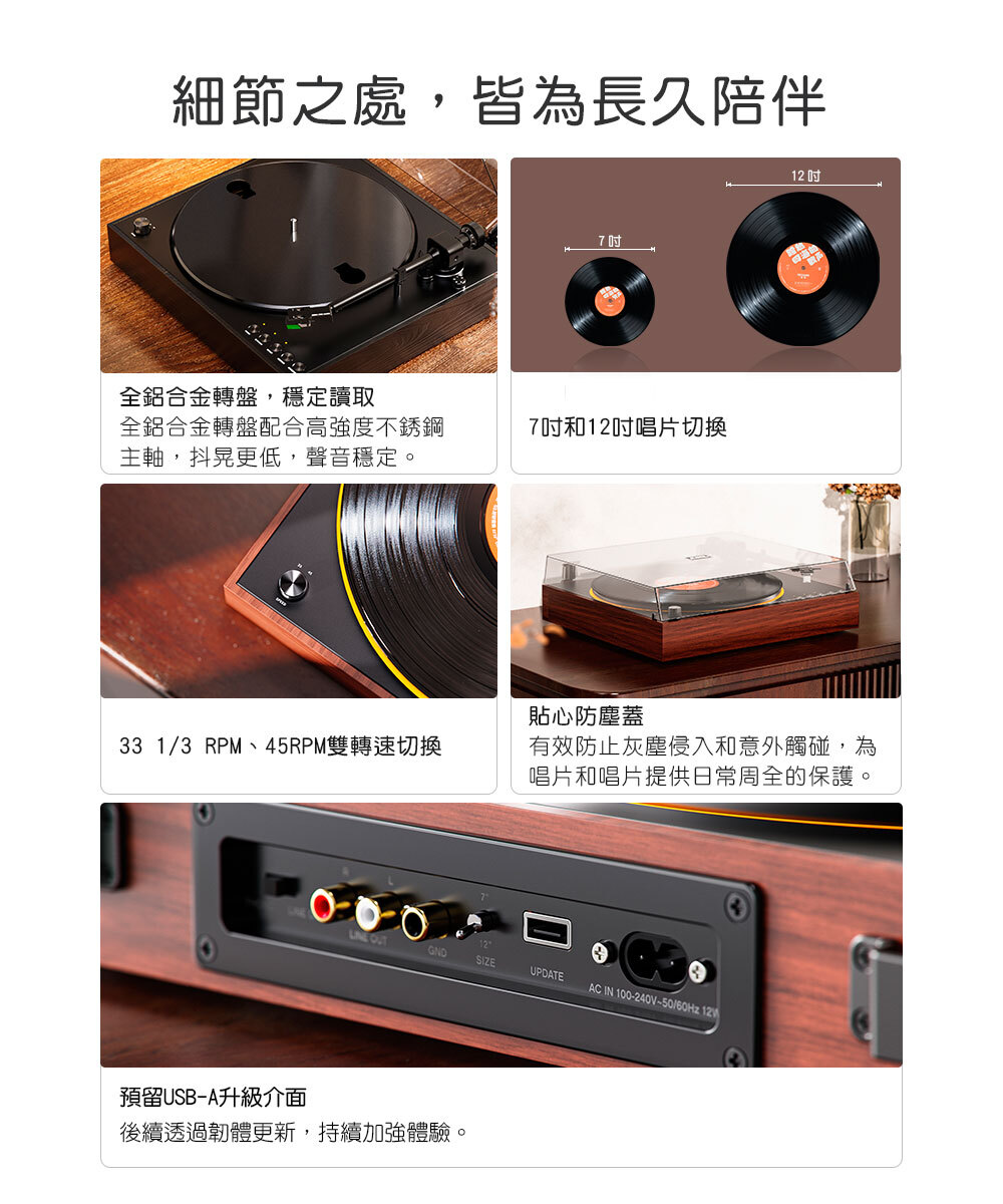 全鋁合金轉盤,穩定讀取|全鋁合金轉盤配合高強度不銹鋼主軸,抖晃更低,聲音穩定。