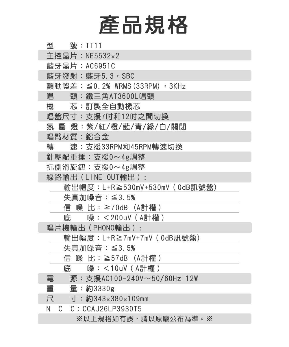 1.本產品僅包含TT11主機*1、透明保護蓋*1、鋁製轉盤*1、轉盤墊*1、針壓調整配重捶*1、翻蓋轉軸*2、電源線*1、RCA音源線*1、
