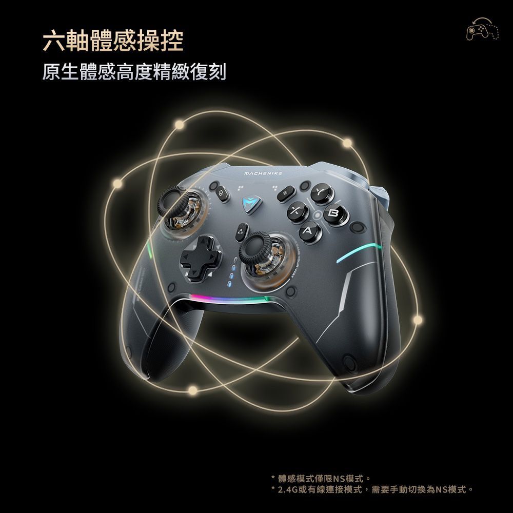 一機雙連,雙機搭配無線接收器;升級全磁吸輕透外殼;搖桿扳機RGB流水互動性燈效;遠程喚醒秒速連接NS;全動作鍵TURBO30檔精控連發。