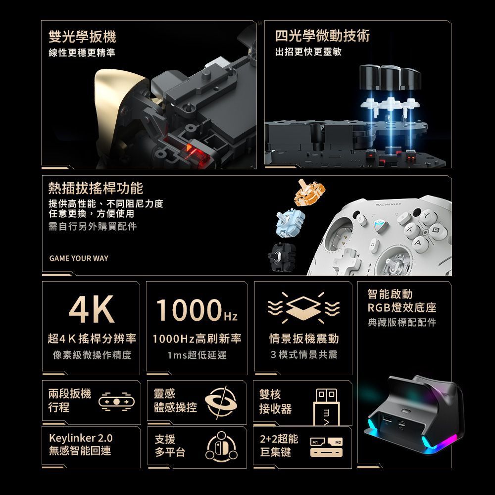 一機雙連,雙機搭配無線接收器;升級全磁吸輕透外殼;搖桿扳機RGB流水互動性燈效;遠程喚醒秒速連接NS;全動作鍵TURBO30檔精控連發。