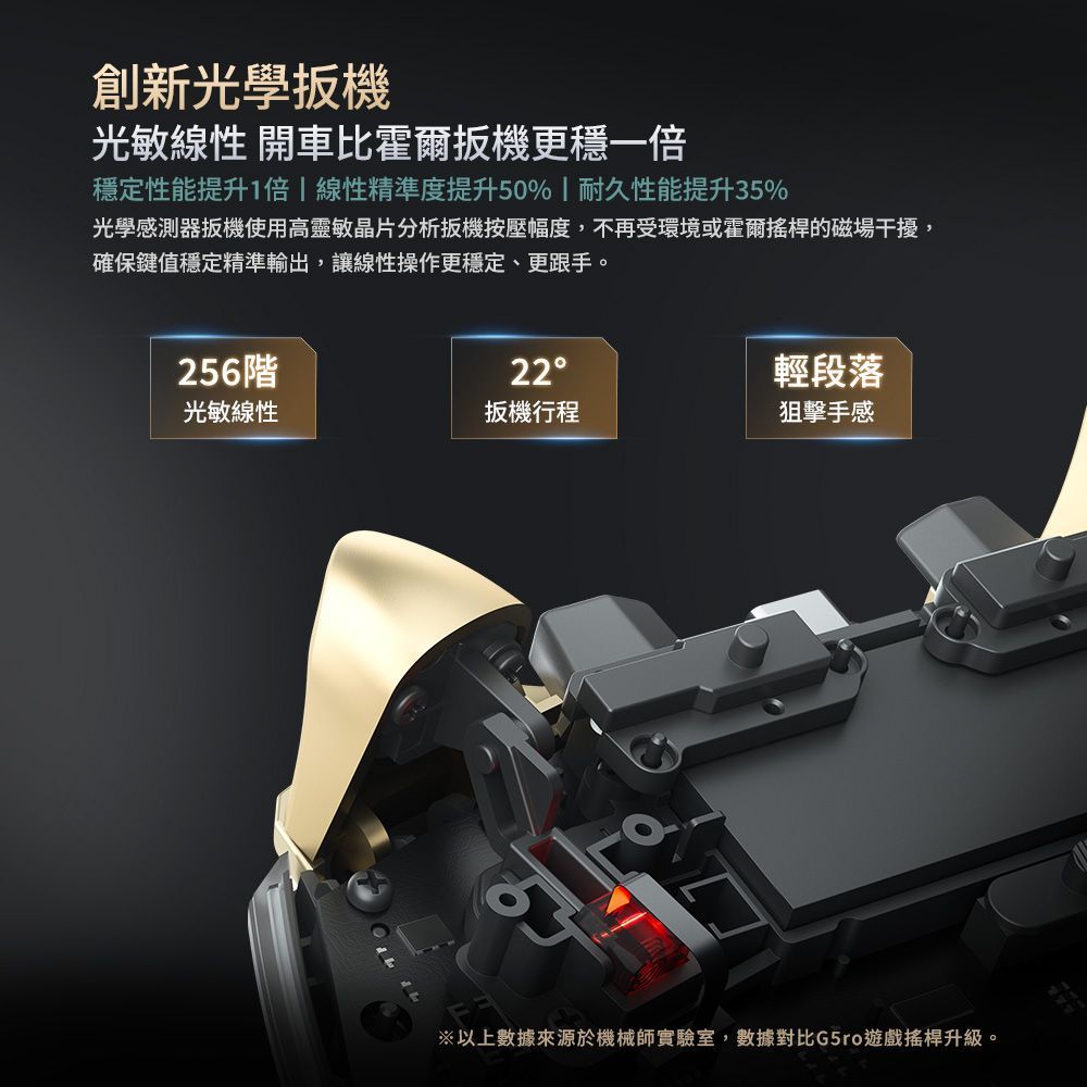 光學感測器扳機使用高靈敏晶片分析扳機按壓幅度,不再受環境或霍爾搖桿的磁場干擾,確保鍵值穩定精準輸出,讓線性操作更穩定、更跟手。