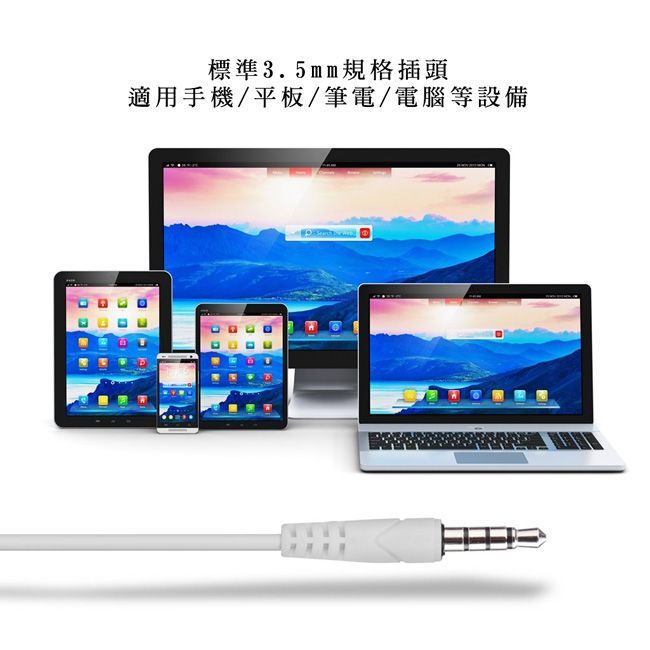 採用標準3.5mm規格插頭,適用手機/平板/筆電等具3.5mm規格設備。