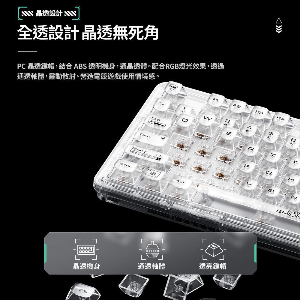 PC 晶透鍵帽,結合 ABS 透明機身,通晶透體。配合RGB燈光效果,透過冰瑩軸體,靈動散射、營造電競遊戲使用情境感。