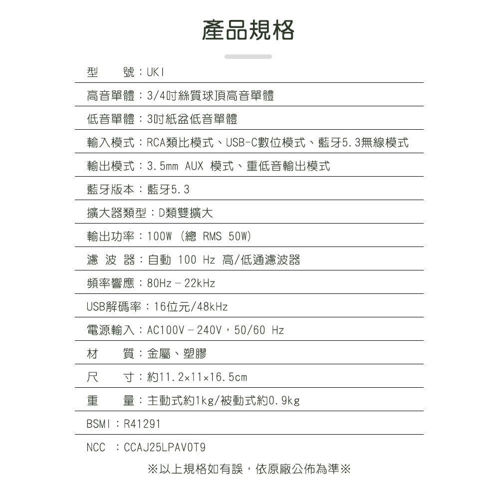 注意事項:本產品僅包含UKI主/副喇叭*1組、4pin連接線*1、電源線*1、橡膠腳墊*8、使用說明書*1,其他播放器、黑膠機...等僅為示意圖,不包含在本產品包裝內。