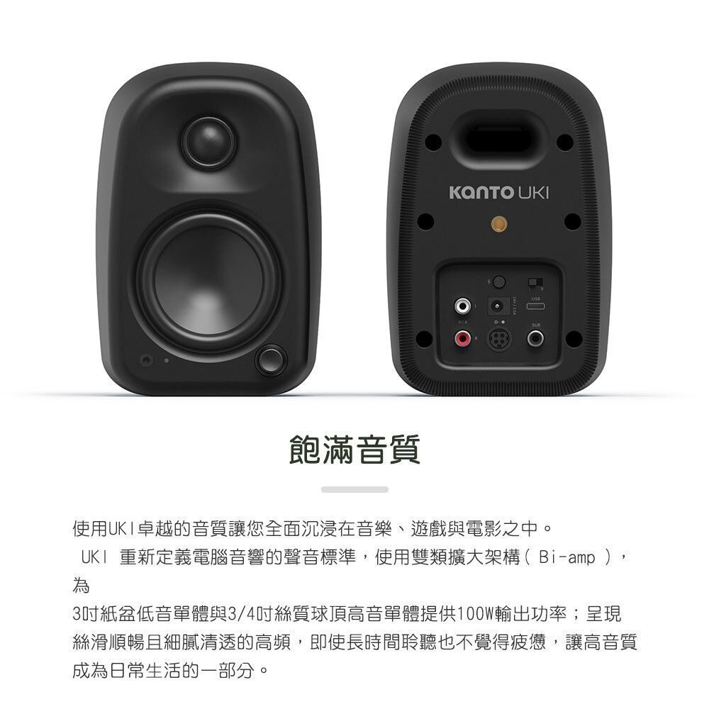 UKI重新定義電腦音響的聲音標準,使用雙類擴大架構(Bi-amp),為3吋紙盆低音單體與3/4吋絲質球頂高音單體提供100W輸出功率;呈現絲滑順暢且細膩清透的高頻,即使長時間聆聽也不覺得疲憊,讓高音質成為日常生活的一部分。