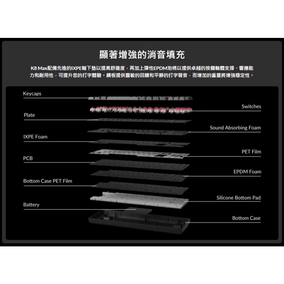 K8 Max透過IXPE、PET和EPDM等多層吸音泡棉升級了打字體驗,確保了卓越的聲音和打字體驗。